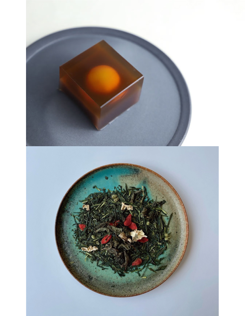 (上)《待月》をテーマにした特製和菓子 (下)《初夏の夕》をテーマにした特製ハーブティー ●ミュージアムカフェENFUSE