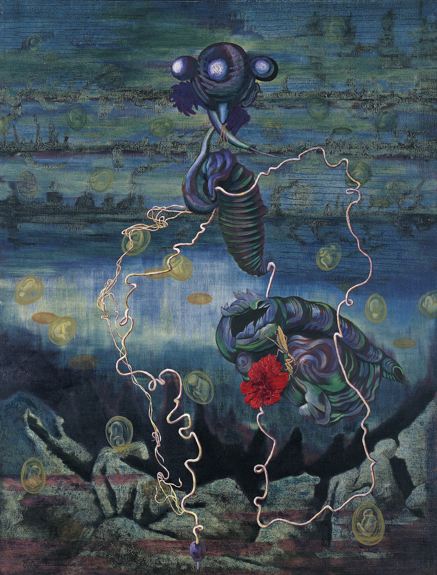 北脇昇《眠られぬ夜のために》1937年 京都市美術館蔵 昨年、西洋美術の個人コレクションの一括寄贈を受けました。特に西洋版画についてはゴヤ、ホガースから始まり20世紀に至るまでを網羅しています。本特集では、なかでも充実した内容を誇る象徴主義を含む世紀末芸術、シュルレアリスム、ウィーン幻想派に属する作品群を紹介します。また、シュルレアリスムに傾倒した京都の洋画家・北脇昇や小牧源太郎の1930年代の作品もあわせて展示し、19世紀末から戦後に至る「幻想の系譜」を辿ります。