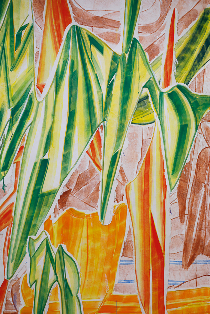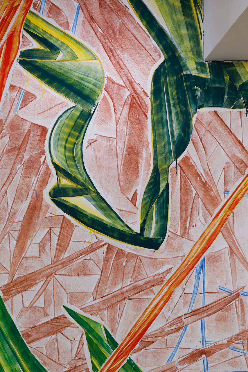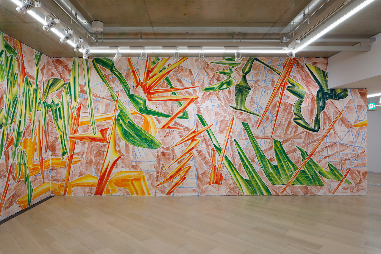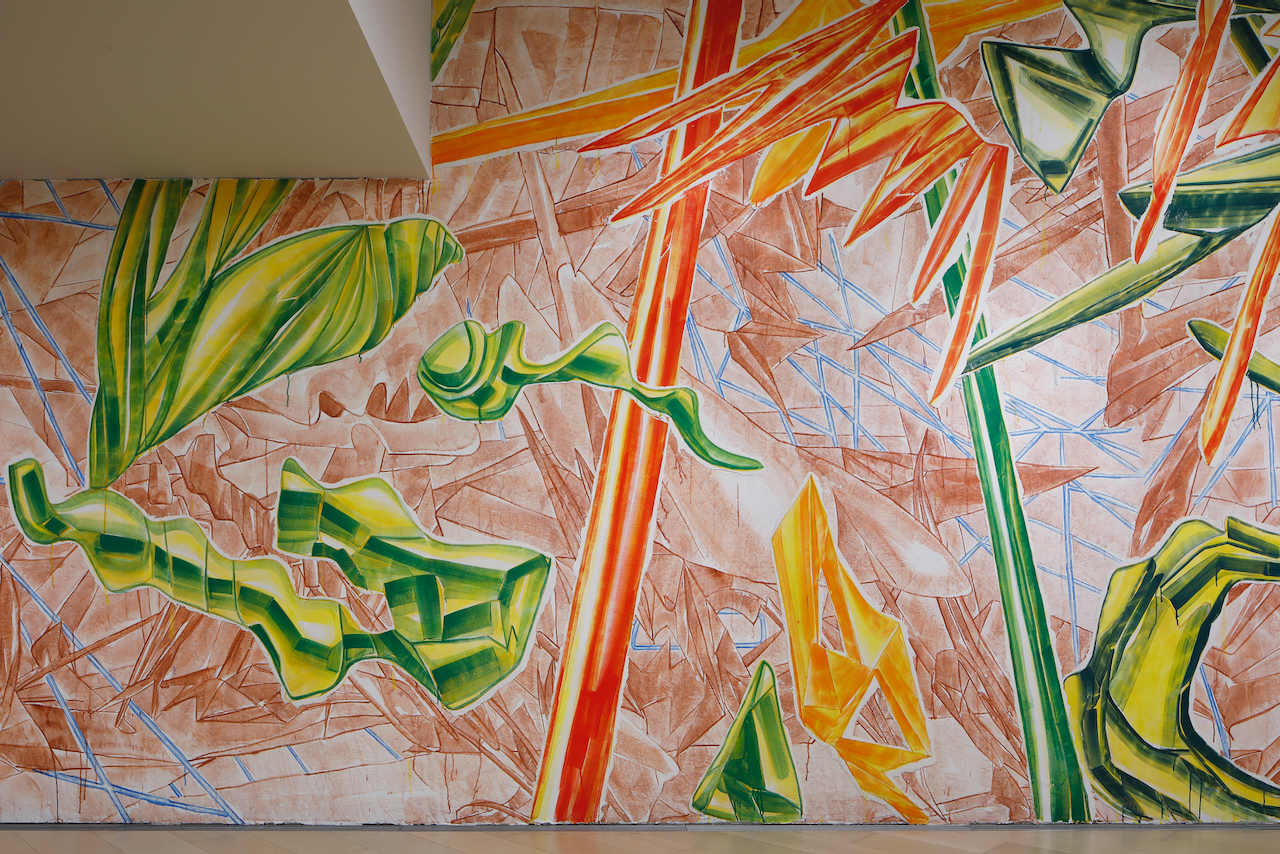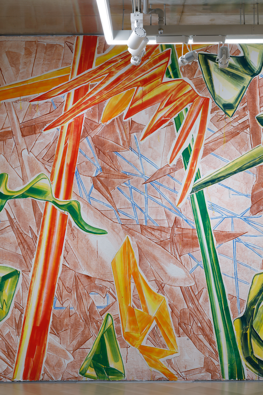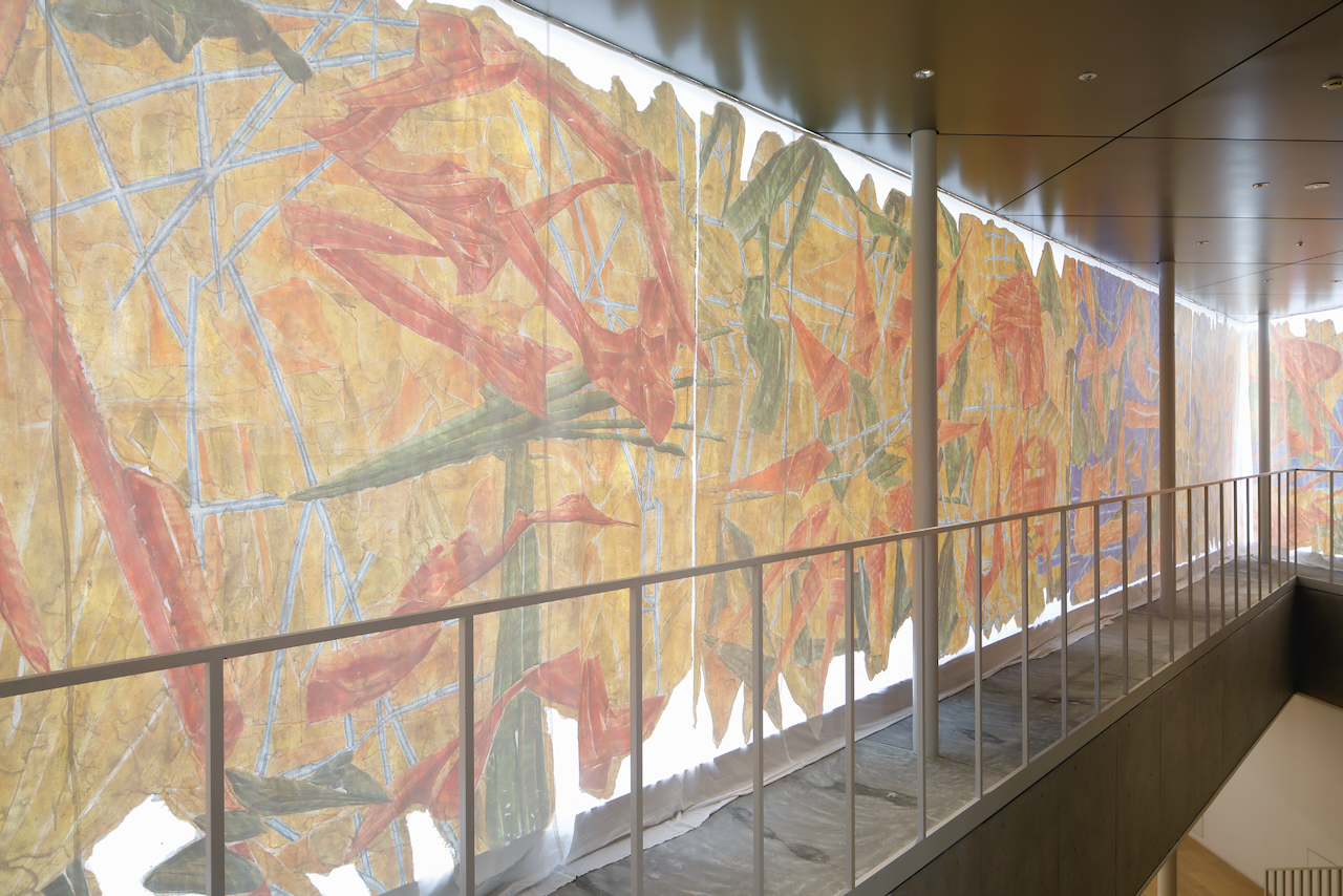こうした郊外をモチーフとし、本展では色とりどりの造形が地上と地下の展示空間全体に展開します。地上では壁画の表層を移し替える技法「ストラッポ」を用いて布地に移された壁画が3面のガラスを覆うように展示され、その両面からみることができます。