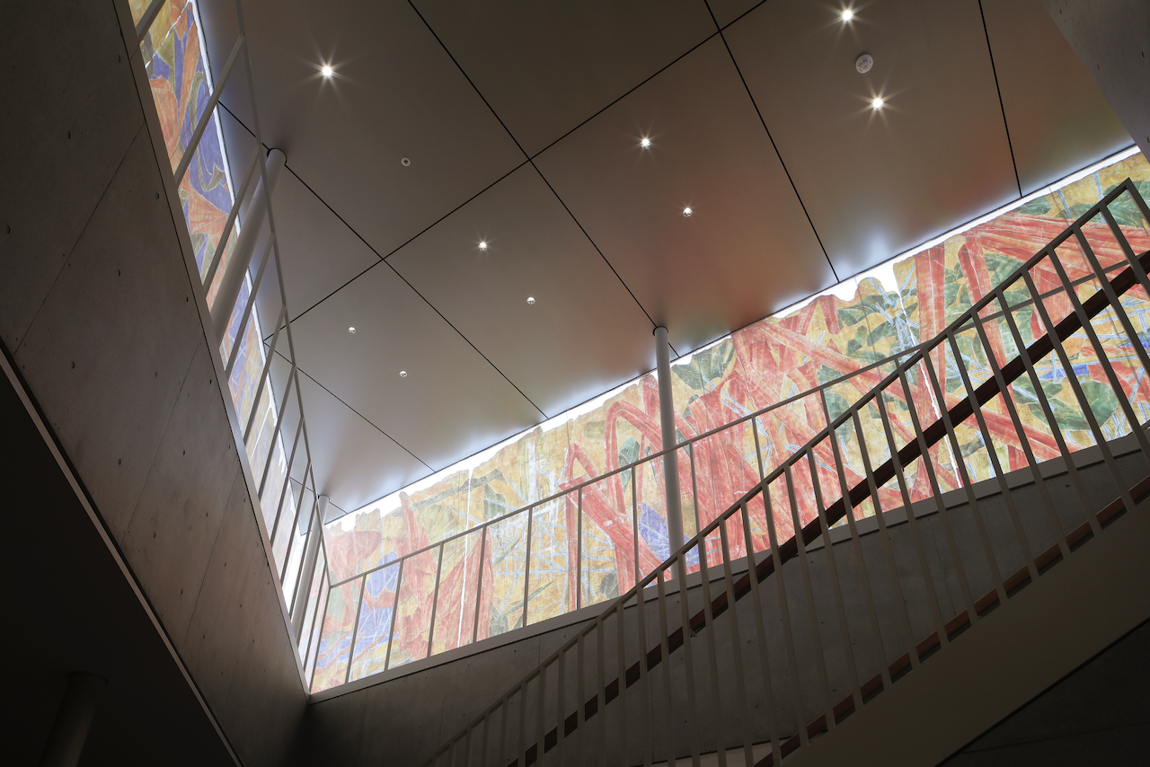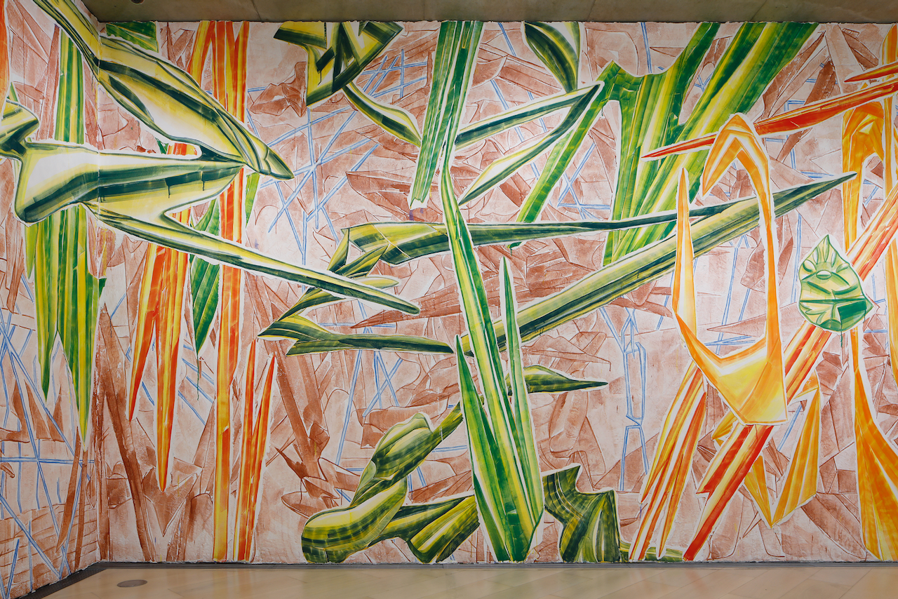 地下の展示室では、地上と同じ下絵を用いながらも、漆喰を支持体に異なる色彩で描かれます。同じイメージの反復は、幹線道路沿いにチェーン店や緑地が繰り返される典型的な郊外の景観を意識させます。また法面や送電塔のイメージは景観から切り離され、断片化され、身体を包み込むようなインスタレーションとして再構成されます。タイトルの「築土構木」は、「土木」の由来とされる言葉です。これは「聖人が民のために土を築き、木を構えて住まいを整え、暮らしの安寧を得る」という意味であり、土木が市民のための技術(Civil Engineering)であるという公共への視点が含まれています。また壁画というメディアも同様に、公共空間に設置され、誰もが見ることができ、設置場所の文脈を留める点などを特徴としています。公共的な要素が含まれた、まさに市民のための芸術です。