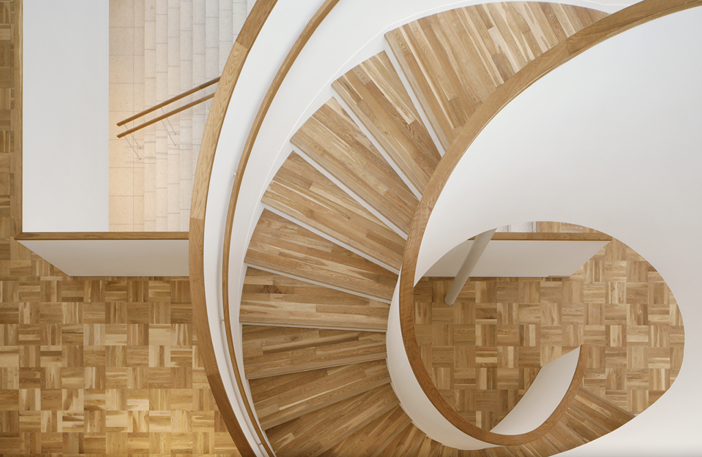 地下1階から2階への3フロアや「北回廊」と「南回廊」、「東山キューブ」や「日本庭園」を自由に往来できるハブになるとともに、天井から作品などを吊りさげて展示できる機構やバルコニー、らせん階段などが賑やかな人々の行き来を加速させます。